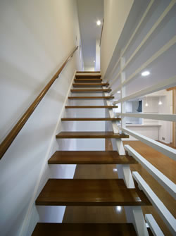 リビングインの階段を見上げた写真です右側の格子状のものは建主の要望により急遽、現場でデザインし施工しましたデザインのアクセントと共にリビング全体への雰囲気を引きしめるものになったと思います